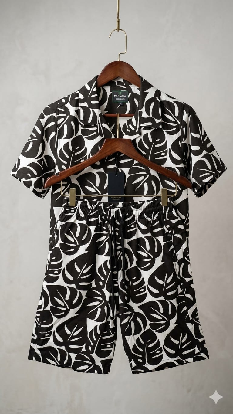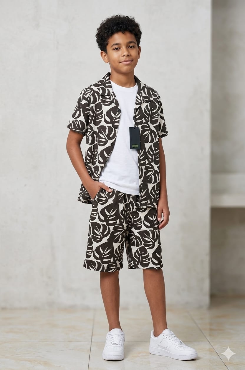 Upgrade your kid’s summer style with this trendy tropical leaf print co-ord set. Featuring a half-sleeve button-down shirt paired with matching shorts, this outfit offers a perfect blend of comfort and fashion. Made from lightweight, breathable fabric, it keeps your child cool and stylish all day long. Ideal for casual outings, vacations, or daily wear, this set delivers a smart, modern look with minimal effort.